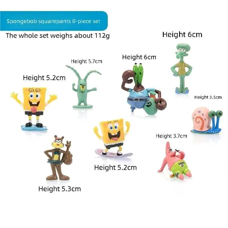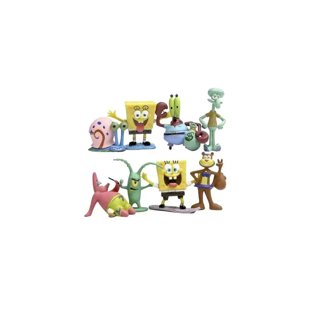 Contiene 8 personajes: Bob esponja x2, Patricio, Gary, Plankton, Arenita, Calamardo y Don Cangrejo.